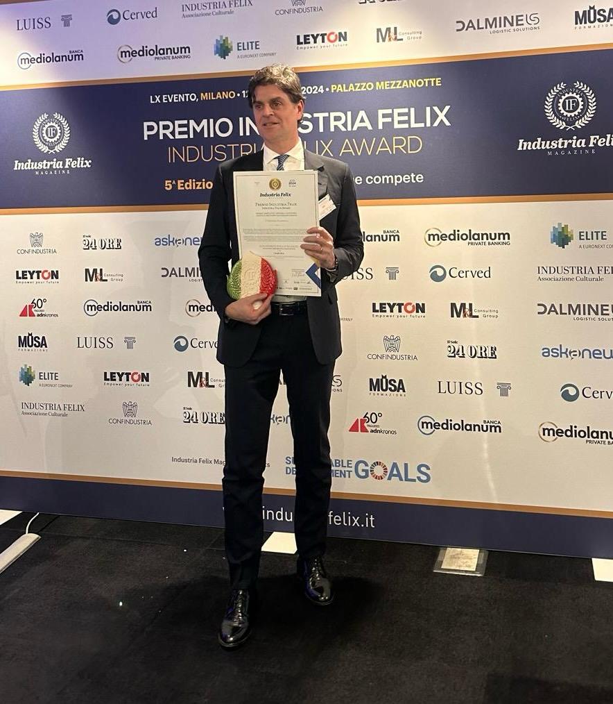 La premiazione è avvenuta nei giorni scorsi a Milano a Palazzo Mezzanotte, sede di ELITE e Borsa Italiana, in occasione del 60° evento organizzato da Industria Felix Magazine, trimestrale fondato e diretto da Michele Montemurro. L’iniziativa nazionale è stata realizzata in collaborazione con Cerved, Università Luiss Guido Carli, Associazione culturale Industria Felix, con il sostegno di Confindustria, con le media partnership de Il Sole 24 Ore, Askanews e Adnkronos, le partnership di Banca Mediolanum, Mediolanum Private Banking, ELITE, Leyton Italia, M&L Consulting Group, Dalmine Logistic Solutions, Musa formazione e lavoro.